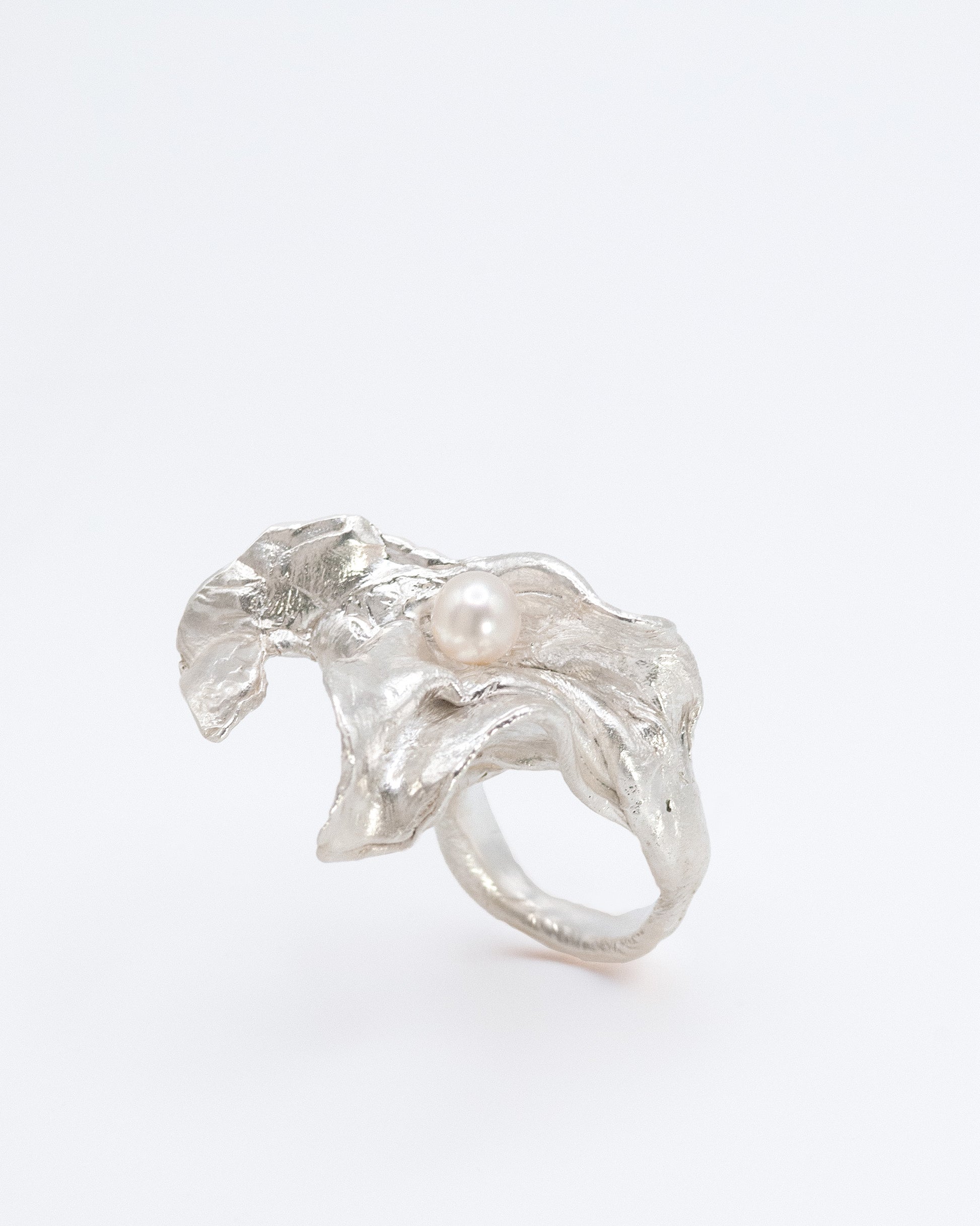 One of a kind ring. Expressive, sculptural floral form hand-sculpted in wax and cast in sterling silver. Set with a 9mm cultured antique pearl. It covers two fingers. Sizing available.